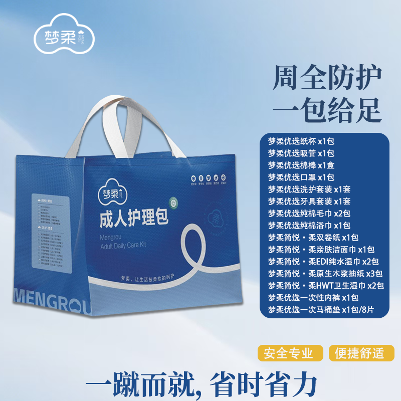 整合多品类护理用品,“把周全的温柔,一包给足”,具备更安全、更专业、更便捷、更舒适、更省时的特点,满足成人住院期间一站式护理需求。